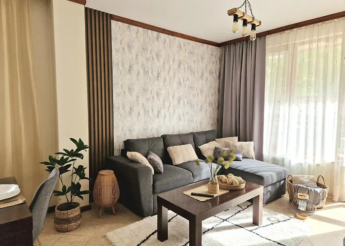 Cozy Wooden Apt In 4-Star Spa Resort Rilski, Incl Wellness Bansko, di 68 m^2, si trova a 2 km dal Comune di Bansko e offre strutture termali come un bagno turco, una sauna e una piscina coperta. Situato a pochi minuti di auto dal Bansko Ski Mania, l'appartamento si affaccia sul giardino.